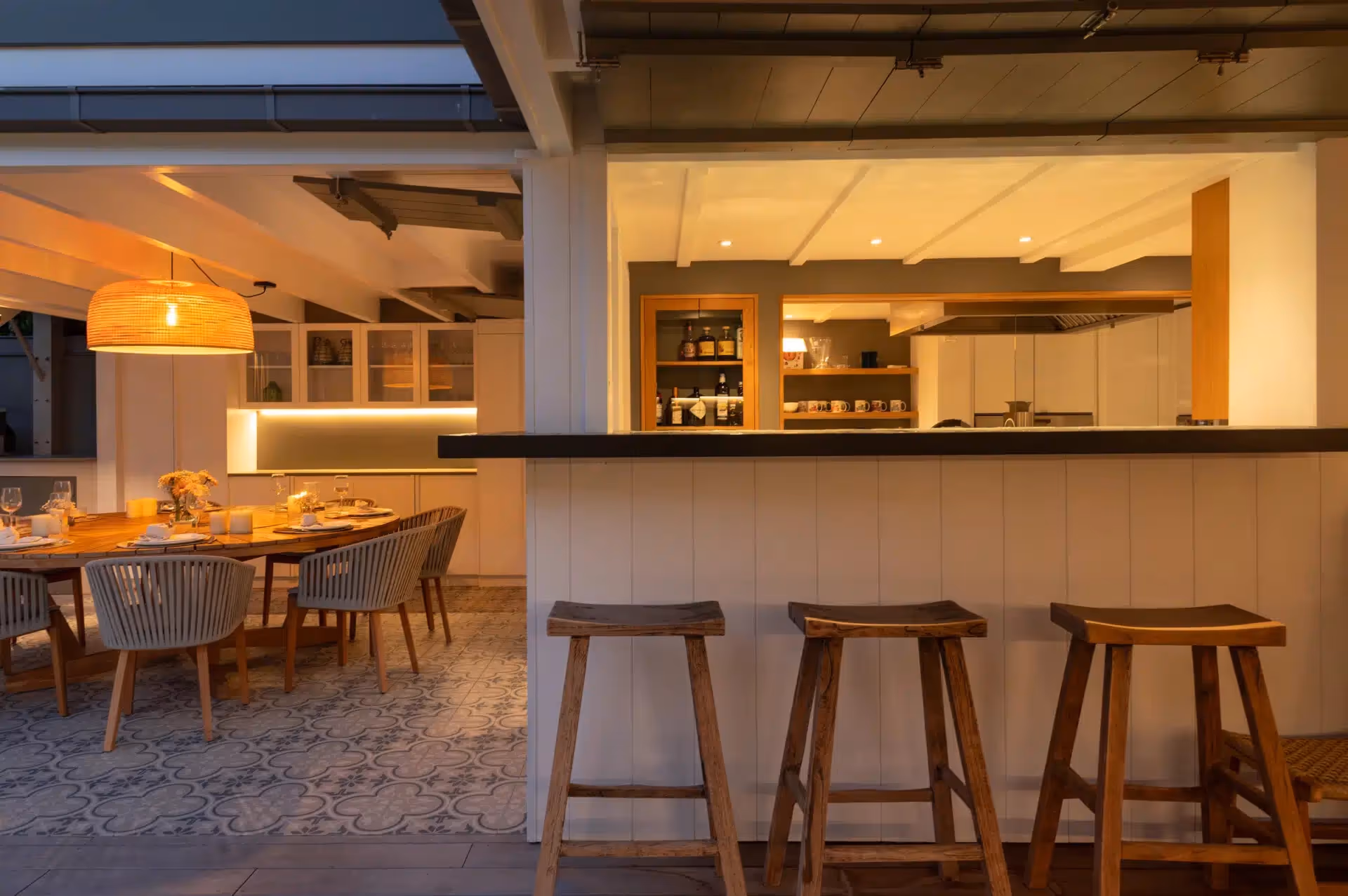 The outdoor living area is the heart of the home, featuring a large sun deck and a swimming pool that serves as the perfect vantage point for the island’s famous golden hour.
