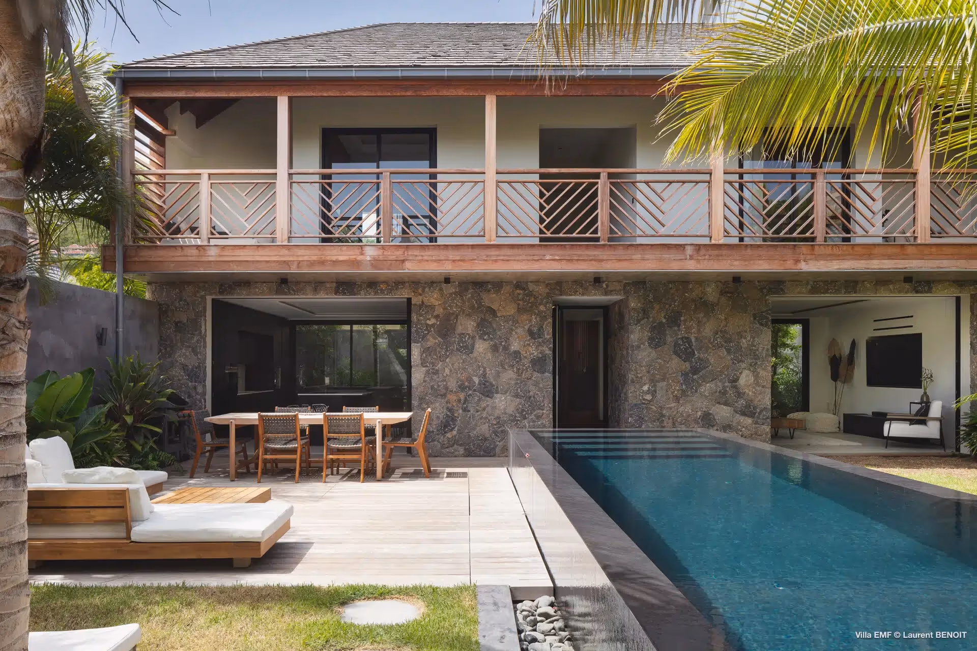 The swimming pool, surrounded by warm wooden decking and exotic plants, serves as the peaceful heart of this elegant estate.