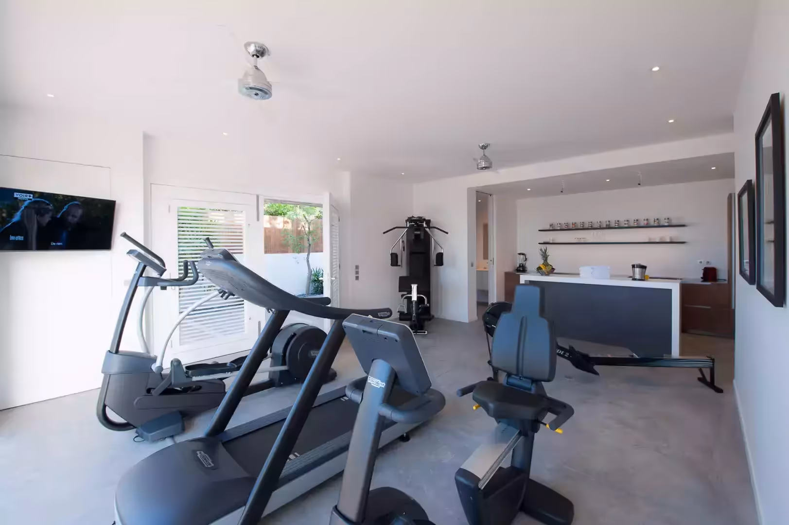 For those who wish to stay active, the villa offers a fully equipped gym, allowing you to maintain your fitness routine in a beautiful setting. After a workout, you can relax in the heated infinity pool, surrounded by an elegant outdoor area with loungers and comfortable seating areas.