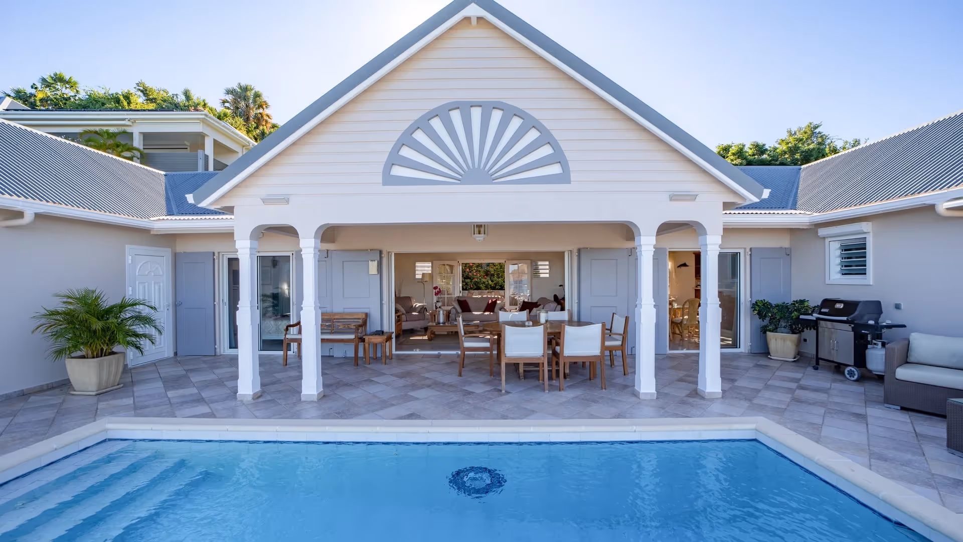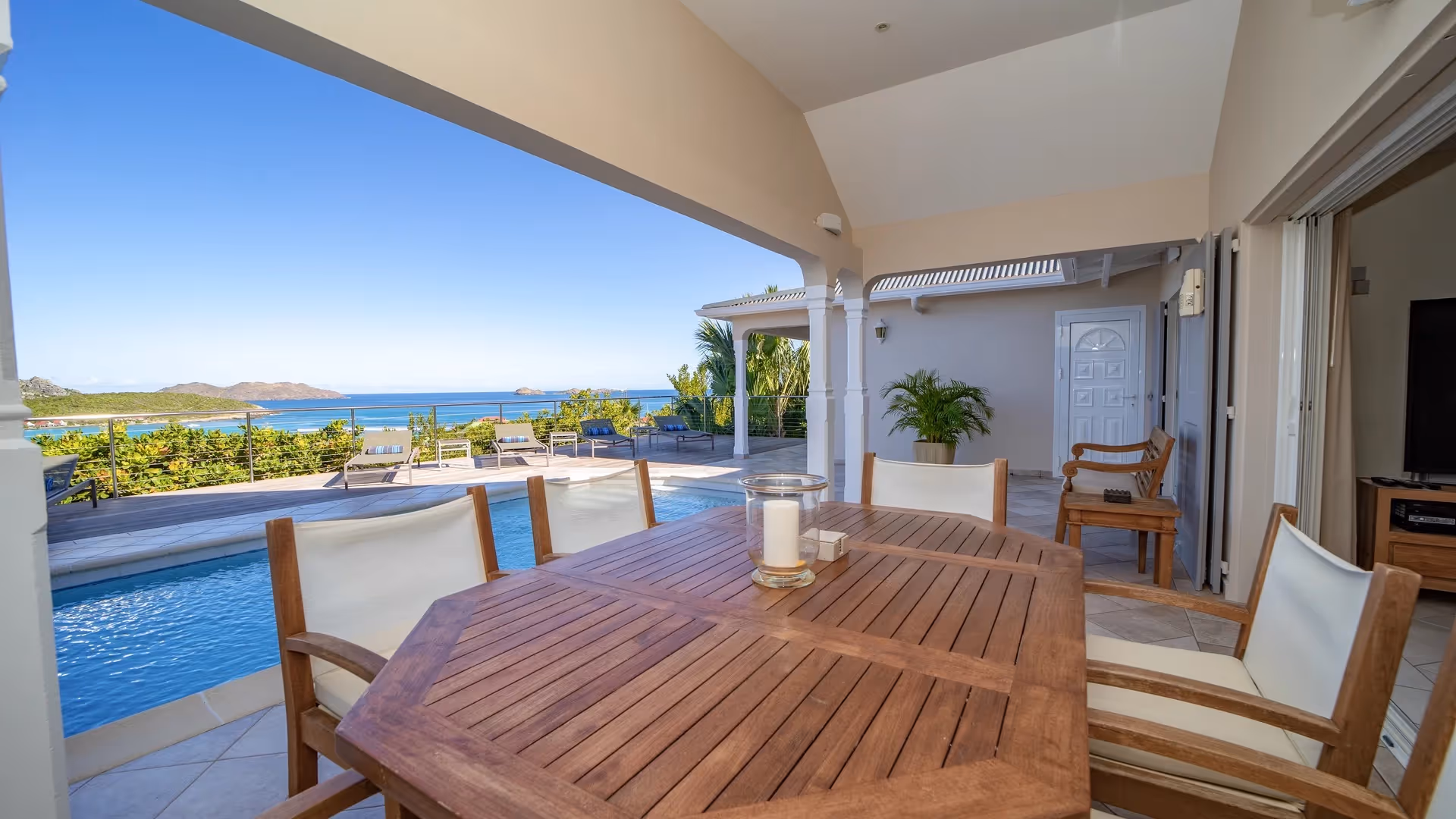 Overlooking the iconic bay of Saint-Jean, this residence embodies a refined Caribbean aesthetic where mahogany structures meet lush tropical surroundings.