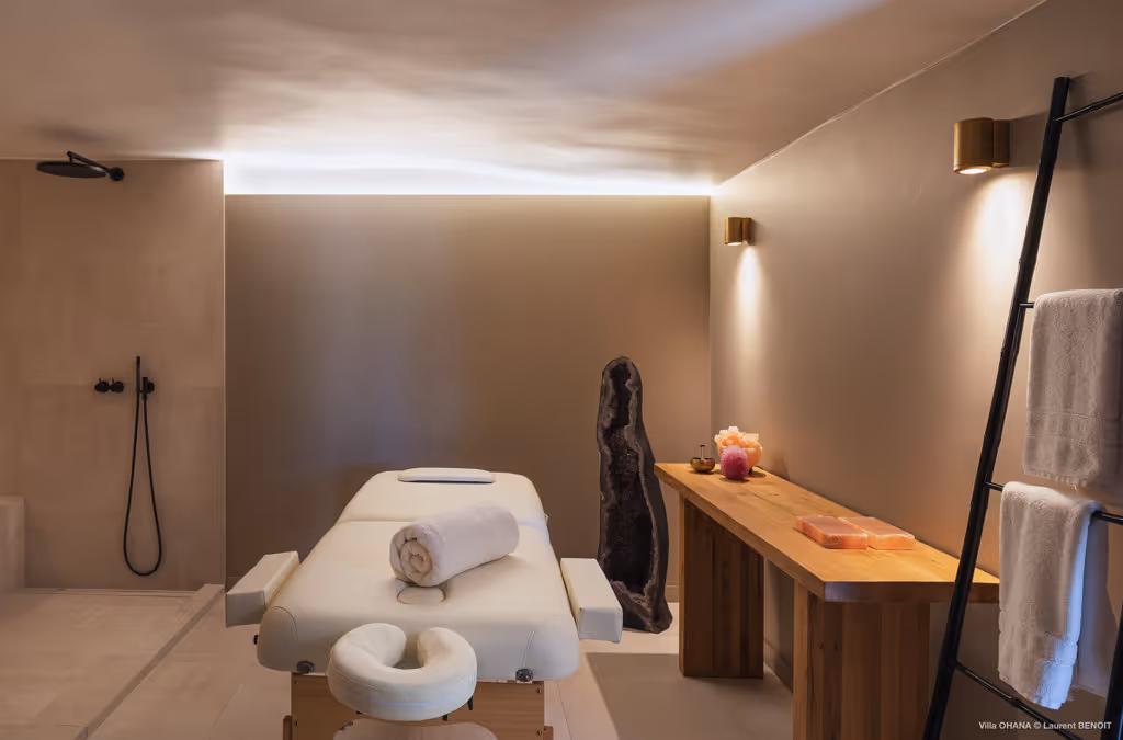 Les installations ont été conçues pour offrir un séjour fluide et harmonieux : deux piscines chauffées, un jacuzzi, un espace de massage avec hammam, une salle de fitness et un court de paddle permettant de varier les activités tout au long de la journée. Plusieurs terrasses, chaises longues et salons extérieurs se répartissent autour de la propriété, invitant à profiter des vues sur la baie, des douces brises marines et des couleurs changeantes du ciel.