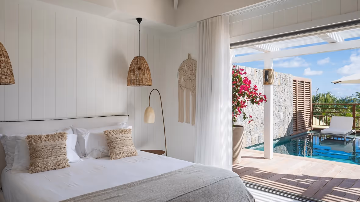 La suite principale bénéficie d'un accès direct aux extérieurs, permettant de profiter des premiers rayons du soleil en toute quiétude.