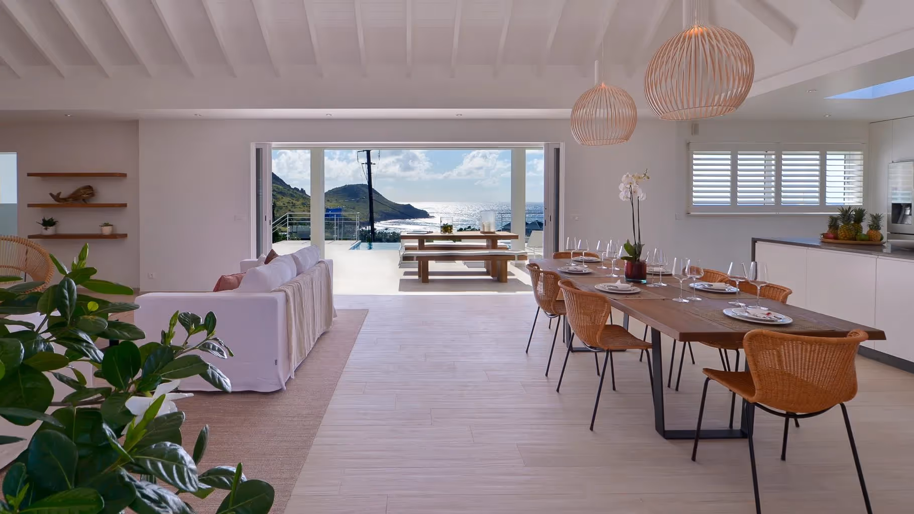 L’espace de vie, entièrement climatisé, s’ouvre largement sur la terrasse et la vue mer. Le salon, aménagé avec de généreux canapés et une télévision HD, prolonge une salle à manger conviviale et une cuisine moderne avec îlot central, baignée de lumière naturelle. Les matériaux choisis, les teintes minérales et les touches boisées créent une ambiance douce et contemporaine, en parfaite harmonie avec l’environnement.